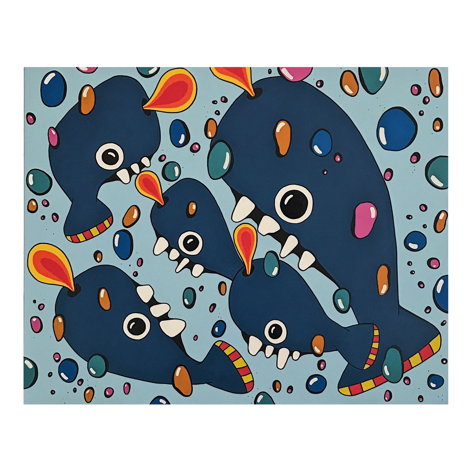 “Tutto è partito da una vacanza a Santo Domingo, durante la quale ebbi l’occasione di vedere da vicino le megattere”, ha raccontato l’artista. “Sono animali migratori molto legati alla famiglia, tanto che a ogni parto festeggiano il nuovo arrivato con dei salti gioiosi. Da quel momento capii che la Blue whale poteva e doveva essere il simbolo di me stesso. Un personaggio sempre in movimento, ma con la bolla al naso. Il simbolo della presenza di un raffreddore, che altro non è che la trasposizione del mio trascorso fisico. E’ un personaggio buono, innocuo e positivo, proprio come me. Si tratta quindi di un modo per raffigurarmi senza per forza dover disegnare un essere umano: nelle mie opere, infatti, l’uomo non compare mai, eccezion fatta per le Moire e per un paio di opere degli esordi”.