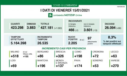 Coronavirus: 326 nuovi contagiati nel Bresciano, 2.205 in Lombardia e 16.146 in Italia. Sono i numeri di oggi, venerdì 15 gennaio, sul fronte Covid-19. Diminuiscono i numeri, sia nella nostra zona che a livello regionale, a fronte di un livello leggermente inferiore di tamponi processato (oggi ne sono stati analizzati 26.535 contro i 28.645 di ieri). Il rapporto tamponi-positivi scende all’8,3% (ieri era al 9%). Sempre alto, però, il numero di nuovi positivi a Brescia, seconda provincia per casi dopo Milano. Ma il dato a livello lombardo scende, eppure siamo (quasi) in zona rossa…