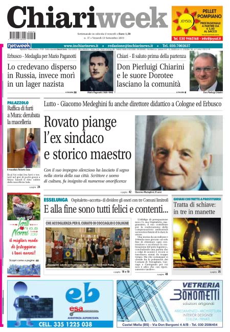 In prima pagina spazio a uno dei personaggi rovatesi che non ci sono più: la città infatti è in lutto per l’ex sindaco e storico maestro, nonché direttore didattico a Cologne ed Erbusco, Giacomo Medeghini. Con il suo impegno silenzioso ha lasciato il segno nella storia di Rovato. A Erbusco, invece, è stato consegnato un premio postumo alla memoria di Mario Paganotti. Lo credevano disperso in Russia, mentre invece morì in un lager nazista.