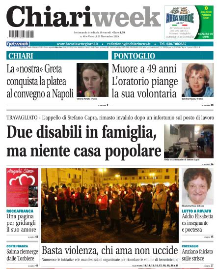 E’ uscito il nuovo numero del settimanale con tante notizie e servizi esclusivi. Il prim pagina ci sono la storia dei Vittoria Forlati, 17enne di Chiari, che ha conquistato la platea al congresso internazionale di Legambiente a Napoli con il suo discorso sulla tutela del pianeta in vero stile Greta Thunberg.