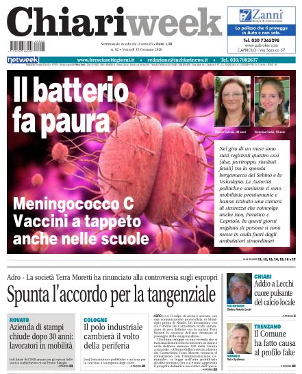 Questa settimana in apertura della prima pagina il servizio per fare il punto sul focolaio di Meningococco C che sta interessando il Basso Sebino e la Valcalepio. Nel giro di un mese sono stati registrati quattro casi (due, purtroppo, risultati fatali) tra la sponda bergamasca del Sebino e la Valcalepio. Le Autorità politiche e sanitarie si sono mobilitate prontamente e hanno istituito una cintura di sicurezza che coinvolge anche Iseo, Paratico e Capriolo. In questi giorni migliaia di persone si sono messe in coda fuori dagli ambulatori straordinari per vaccinarsi.