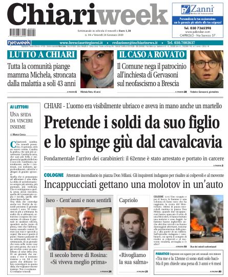 Questa settimana in prima pagina un caso di nera avvenuto a Chiari. Un 62enne che pretendeva soldi dal figlio lo ha spinto giù dal cavalcavia di via Sant’Angela Merici. Aveva in mano anche un martello. Fondamentale l’intervento dei carabinieri: l’uomo è stato arrestato e portato in carcere. Lutto, sempre a Chiari, per mamma Michela Rota, mancata a 43 anni a causa della malattia.