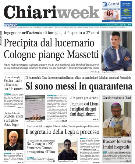 Questa settimana in apertura della prima pagina la tragedia che ha colpito la comunità di Cologne. Giorgio Massetti, ingegnere 37enne, è precipitato da un lucernario che gli è crollato sotto i piedi venerdì mattina. A nulla sono valsi i soccorsi e sull’infortunio sul lavoro dall’epilogo drammatico indaga la Procura. I funerali saranno celebrati domani, sabato nella parrocchiale, mentre la veglia è in programma per questa sera, venerdì. Figura molto apprezzata e stimata in paese, era da anni presidente della Handball Franciacorta. La sua scomparsa lascia nel dolore la moglie e le due bambine, cui si stringe tutta la comunità di Cologne e di Erbusco.