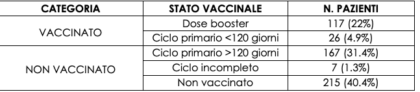 I pazienti sottoposti a identificazione della variante sono 142, dei quali 103 con variante Delta (72.5%) e 39 (27.5%) con variante Omicron. L’età media dei pazienti con variante Omicron (66.3 (±24.8) anni) è risultata inferiore rispetto all’età media dei pazienti con variante Delta (71.4 (±15.0) anni). Il dato della copertura vaccinale nei pazienti sottoposti a genotipizzazione è stato recuperato per 136 pazienti; ed è risultato diverso nelle due popolazioni, con una quota di vaccinati superiore per la variante Omicron (31.6%) rispetto alla variante Delta (11.2%).