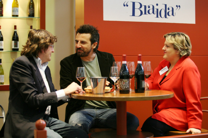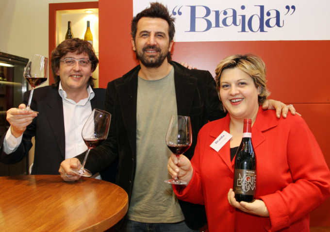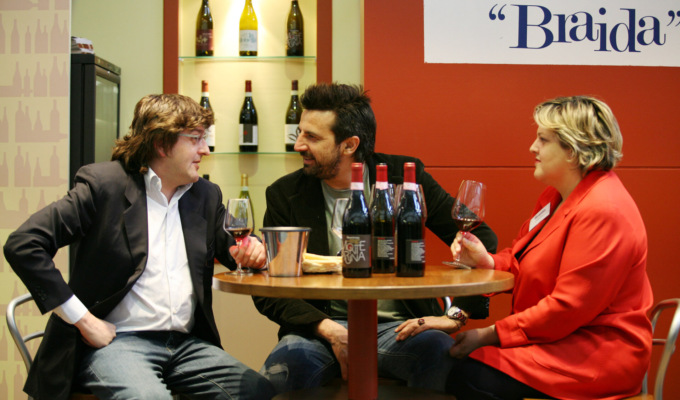 OMAR PEDRINI e cantine BRAIDA presentano la vendemmia 2008 del Montebruna, la barbara rock. Qui con i fratelli RAFFAELLA e GIUSEPPE BOLOGNA (titolari cantina)