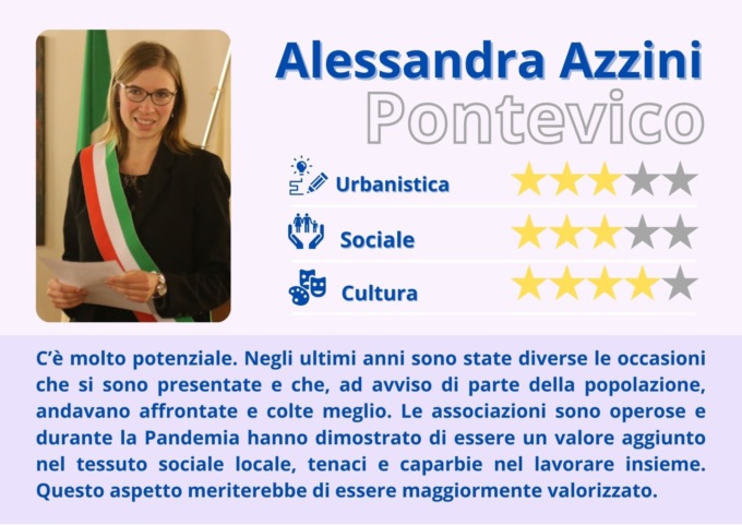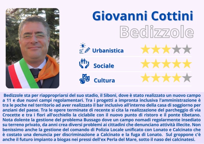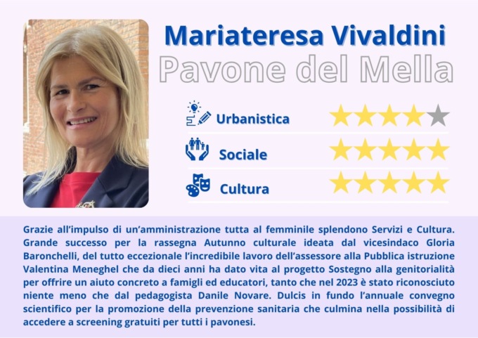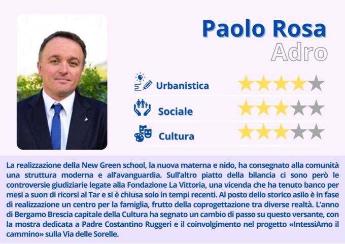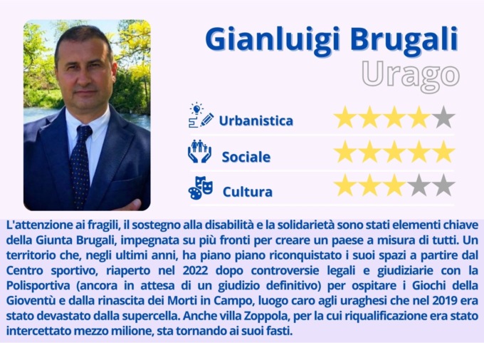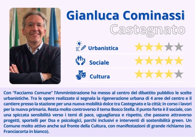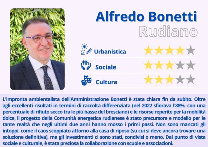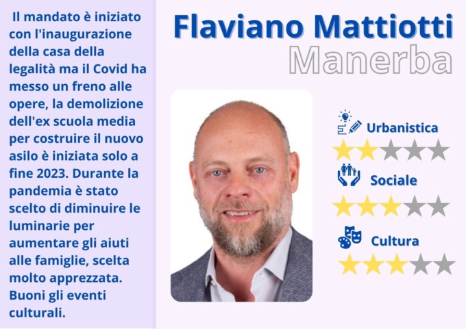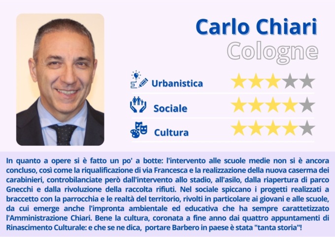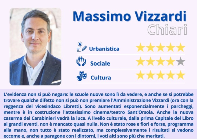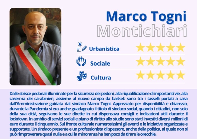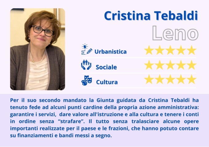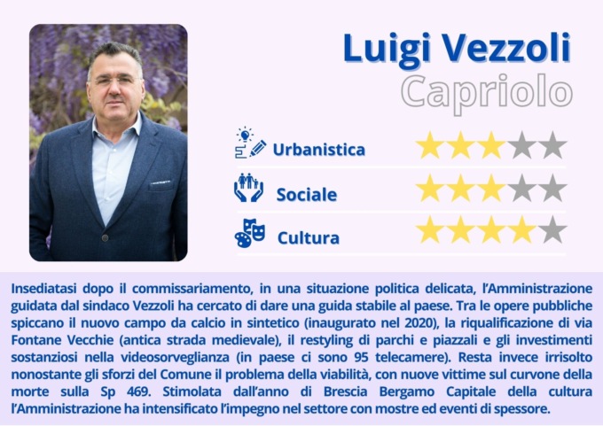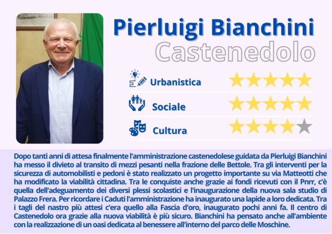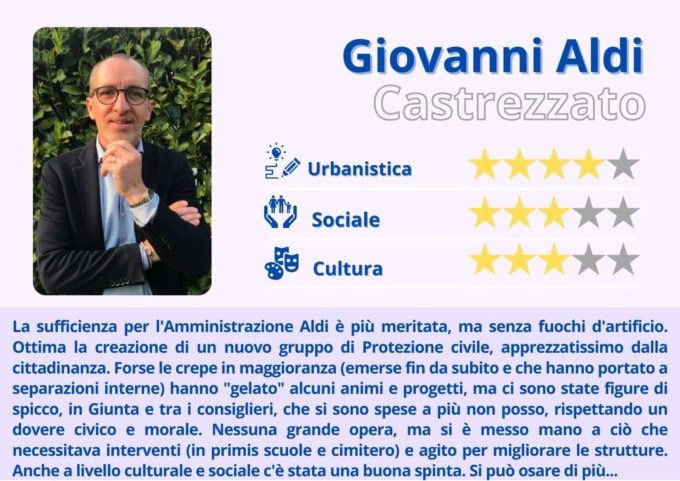 Tirando le somme della cronaca politica e amministrativa degli ultimi cinque anni, Comune per Comune, con i settimanali ChiariWeek, MananerbioWeek, MontichiariWeek e GardaWeek abbiamo cercato – in poche righe e a nostro sindacabilissimo giudizio, s’intende – di riassumere l’andazzo delle Amministrazioni e di chi le dirige. Tre le materie in cui abbiamo «giudicato» ciascun sindaco. Si tratta dell’Urbanistica (dalle opere pubbliche alla gestione del territorio, passando per l’attenzione al verde e alla sostenibilità); del Sociale (dalla crisi post-Covid, ai rapporti con il Terzo settore, passando per i servizi di base quali scuole e asili); e della Cultura, o più in generale la promozione della partecipazione alla vita del paese.