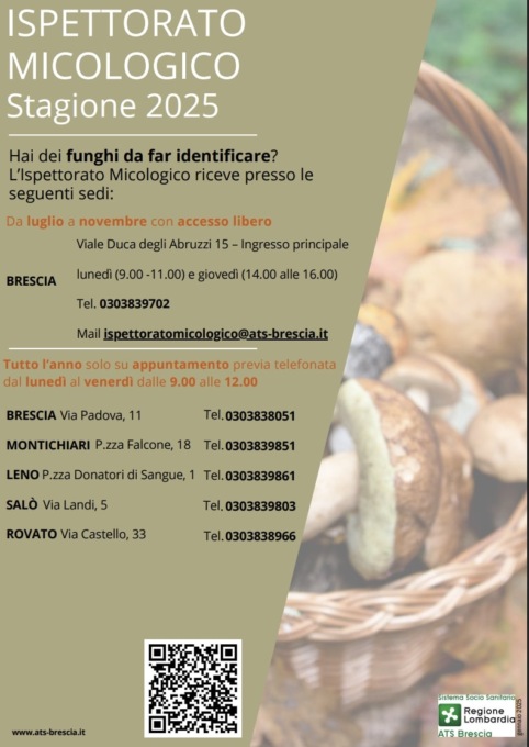 I cittadini che hanno raccolto funghi selvatici per un consumo privato possono accedere gratuitamente all’Ispettorato e far identificare i funghi commestibili da un Ispettore Micologo qualificato. Nella sede di Viale Duca degli Abruzzi 15, Brescia, l’accesso è libero da luglio a novembre.
