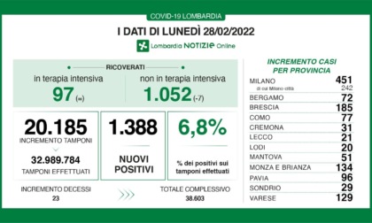 Bergamo: 72; Brescia: 185 (dall’inizio della pandemia sono 293.093); Como: 77; Cremona: 31; Lecco: 21; Lodi: 20; Mantova: 51; Milano: 451; Monza e Brianza: 134; Pavia: 96; Sondrio: 29; Varese: 129.