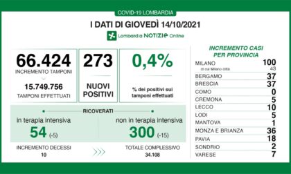 I nuovi casi positivi: 273; i tamponi processati 66.424 (ieri 53.236), con un rapporto positivi/tamponi allo 0,4% (ieri 0,5%); i ricoverati in terapia intensiva: 54 (-5); i ricoverati non in terapia intensiva: 300 (-18); i decessi: 10 (ieri 5), mentre dall’inizio della pandemia sono 34.10.