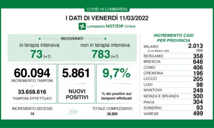 I nuovi casi positivi: 5.861 (ieri 5.813); i tamponi processati 60.094 (ieri 68.954) con il tasso di positività al 9,7% (ieri 8,4%); i ricoverati in terapia intensiva: 73 (+1); i ricoverati in reparto: 783 (+7); i decessi: 19 (ieri 25), mentre dall’inizio della pandemia sono 38.889.