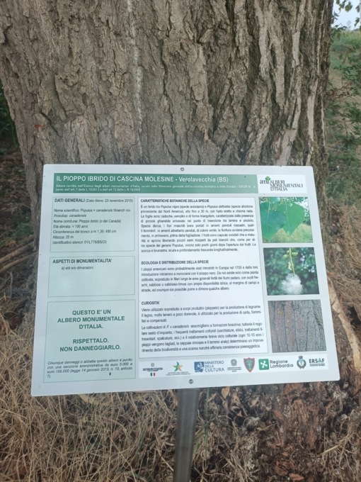 Infatti lunedì 21 luglio è stata posata la targa di riconoscimento (censimento) del pioppo ibrido, sito alla cascina Molesine, quale “Albero monumentale d’Italia”. Un bel risultato che va ad ingrossare la già nutrita schiera di alberi monumentali siti in Lombardia.