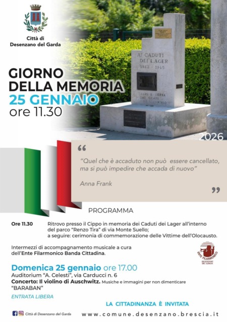 Domenica 25 gennaio 2026 alle 11.30 ritrovo al Cippo in memoria dei Caduti dei Lager all’interno del Parco Renzo Tira di via Monte Suello a Desenzano del Garda. A seguire cerimonia di commemorazione delle vittime dell’Olocausto. Nel pomeriggio, alle 17, l’auditorium Celesti di via Carducci 6 ospiterà Concerto: Il violino di Auschwitz, musiche e immagini per non dimenticare “Baraban”. Entrata libera.