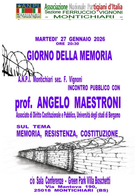 Martedì 27 gennaio 2026 alle 20.30 l’Anpi Montichiari sezione F. Vignoni organizza l’incontro pubblico don il professor. Angelo Maestroni, associato di Diritto Costituzionale e Pubblico, Università degli Studi di Bergamo interverrà sul tema “Memoria, Resistenza, Costituzione.