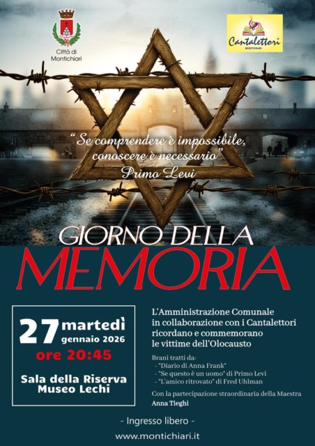 Appuntamento martedì 27 gennaio 2026 alle 20.45 nella Sala della Riserva al Museo Lechi. L’Amministrazione comunale in collaborazione con i Cantalettori ricordano e commemorano le vittime dell’Olocausto.