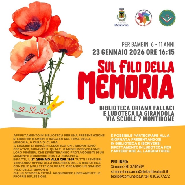Sul Filo della Memoria: martedì 27 gennaio 2026 i pensieri scritti dai bambini verranno appesi alla ringhiera della biblioteca con fili e mollette colorate creando così un grande Filo della Memoria. Coloro che lo desiderassero potranno aggiungere i propri pensieri e le proprie riflessioni.