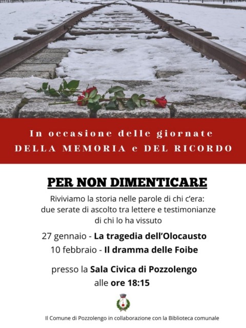 Due appuntamenti in occasione della Giornata della Memoria e del Ricordo (10 febbraio) a Pozzolengo: martedì 27 gennaio 2026 la sala civica ospiterà “La tragedia dell’Olocausto” mentre martedì 10 febbraio sarà la volta di “Il dramma delle foibe”. Entrambi gli appuntamenti, organizzati dal comune di Pozzolengo in collaborazione con la biblioteca comunale, sono in programma per le 18.15.