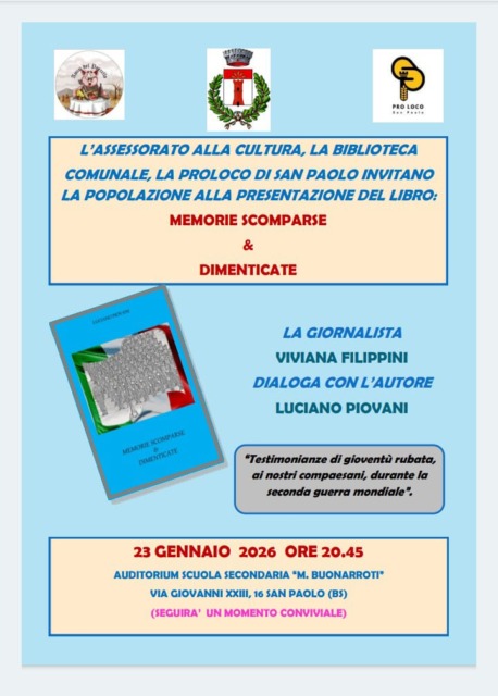 Presentazione del libro: Memorie Scomparse & Dimenticate. L’organizzazione è a cura dell’assessorato alla Cultura, la Biblioteca comunale , la Pro Loco di San Paolo. Appuntamento venerdì 23 gennaio 2026 alle 20.45 nell’auditrium della scuola secondaria M. Buonarrotti in via Giovanni XXIII, 16. A seguire un momento conviviale. A dialogare con l’autore Luciano Piovani la giornalista Viviana Filippini.