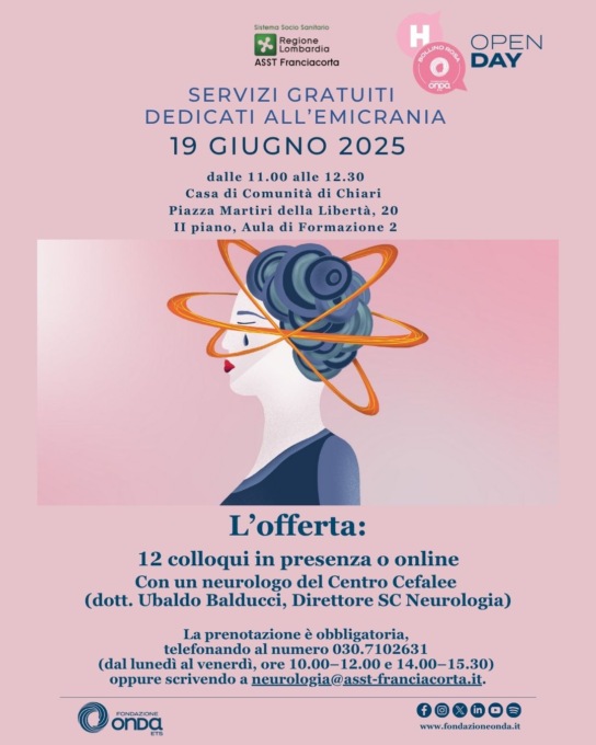 “Anche quest’anno ASST Franciacorta aderisce con convinzione alla giornata promossa dalla Fondazione Onda ETS dedicata all’emicrania, con l’obiettivo di sensibilizzare sull’importanza della diagnosi precoce e di offrire un concreto supporto alla popolazione. Essere un Ospedale con il Bollino Rosa ci consente di promuovere giornate come questa, in cui mettiamo a disposizione gratuitamente visite, consulenze ed esami, rafforzando il nostro ruolo di presidio di salute e prevenzione sul territorio, soprattutto a favore della popolazione femminile, spesso maggiormente colpita da queste patologie”, ha dichiarato il Direttore Generale di ASST Franciacorta, Alessandra Bruschi.