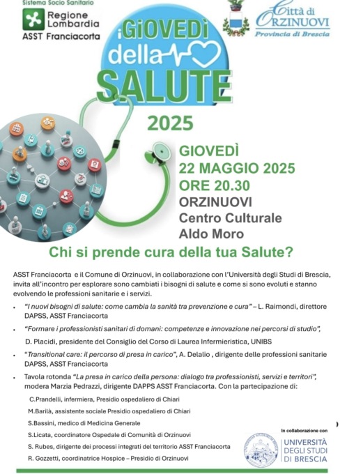 Promosso da ASST Franciacorta e dal Comune di Orzinuovi, in collaborazione con l’Università degli Studi di Brescia, l’evento è gratuito e aperto a tutti. L’iniziativa nasce dalla volontà di costruire un dialogo consapevole, mettendo al centro l’evoluzione dei bisogni di salute e le trasformazioni in atto nei servizi e nelle professioni sanitarie.
