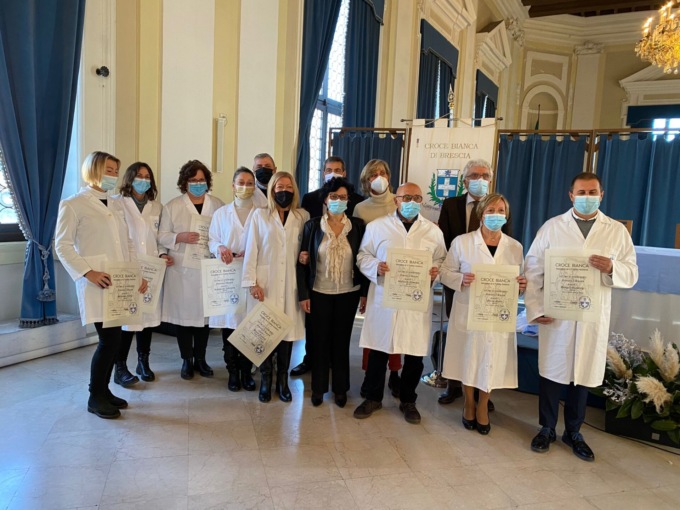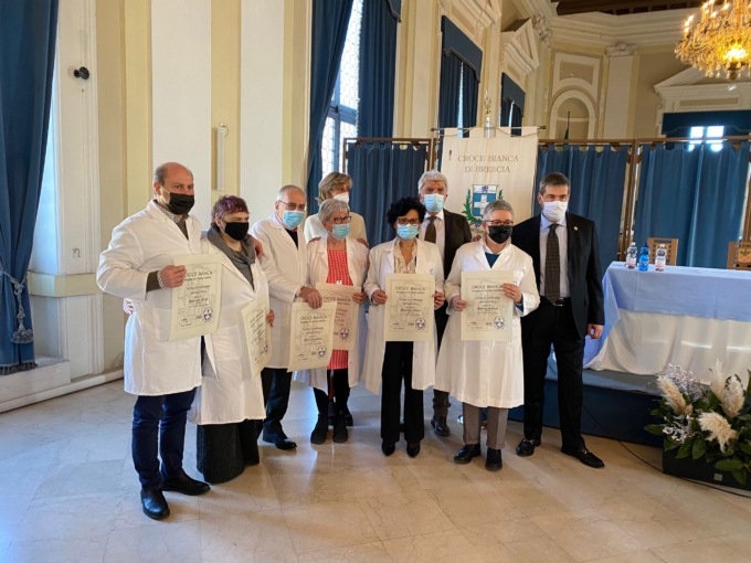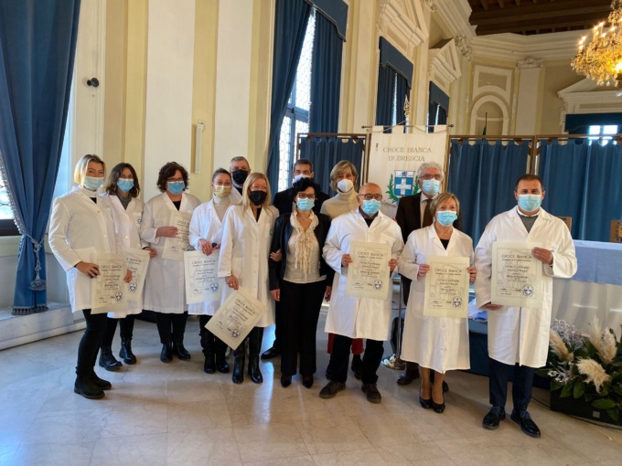 I militi della Croce Bianca premiati a Chiari: la cerimonia è andata in scena questa mattina, domenica 12 dicembre, nel salone Marchetti sopra la biblioteca, alla presenza della presidente Lisetta Mingardi (con il Direttivo e i militi) del sindaco Massimo Vizzardi, dell’assessore ai Servizi sociale Vittoria Foglia, del consigliere regionale Simona Tironi (anche vice presidente della Commissione Sanità) e tanti altri ospiti.