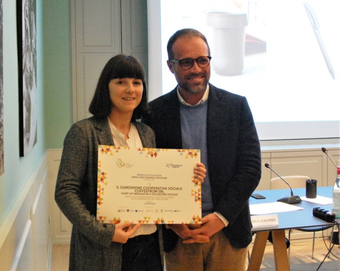 - Il premio Confcooperative Brescia, dedicato al mondo del terzo settore, è stato consegnato da Michele Pasinetti, vice presidente di Confcooperative Brescia, a Coffeefrom srl, start up innovativa a vocazione sociale nata dal progetto de Il Giardinone cooperativa sociale. A ritirare l’attestato Laura Gallo, founder, che in estrema sintesi ha spiegato come la start up trasforma i fondi di caffè – normalmente smaltiti in discarica – dell’industria alimentare italiana in nuovi materiali e prodotti di design.