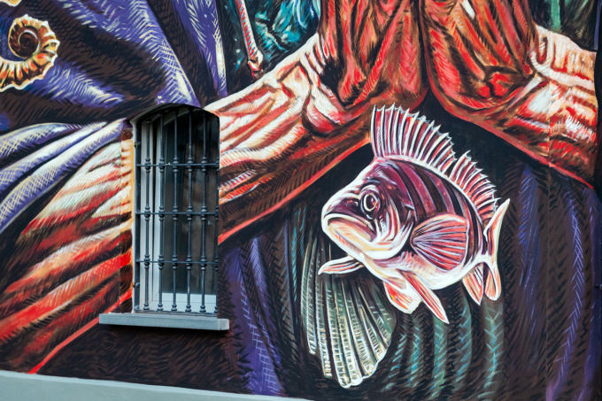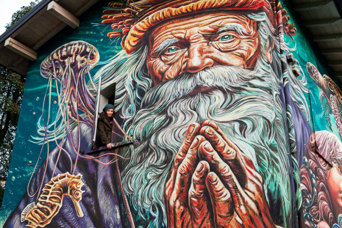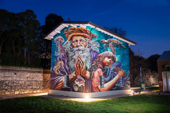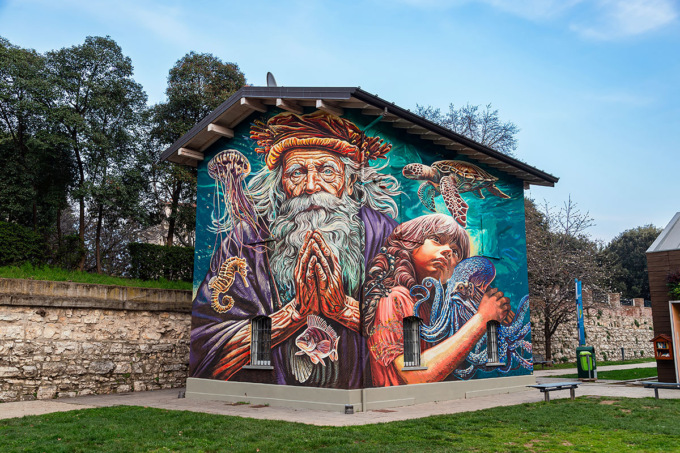 Il murale raffigura un immaginario dall’atmosfera sospesa, abitato da figure umane e animali: sono un uomo anziano e una bambina, appoggiati l’uno all’altra; compaiono poi un cavalluccio marino, un pesce persico, una medusa, una tartaruga. I protagonisti del murale sono metafore: il vegliardo barbuto dalla capigliatura folta è un provato e preoccupato Poseidone, ormai lontano dalla forza della divinità ellenica; accanto a lui la bambina tiene in braccio un polpo, ha lo sguardo alzato verso la luce, in un atteggiamento di attenzione e curiosità.