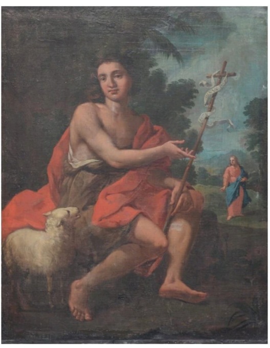 La figura di San Giovanni Battista, con lo sguardo rivolto ai fedeli, occupa quasi integralmente lo spazio; leggermente decentrato verso sinistra siede su un sasso, la mano sinistra regge la croce di canne incrociate alla quale è avviluppato un sottile cartiglio con la scritta «Ecce Agnus Dei». La mano destra morbidamente indica la figura evanescente del Cristo che si manifesta al centro del paesaggio, con toni luminosi e chiari in un degradare di sfumature verdi-azzurre. L’agnello è posizionato alla sinistra del Santo, con lo sguardo rivolto verso di lui.