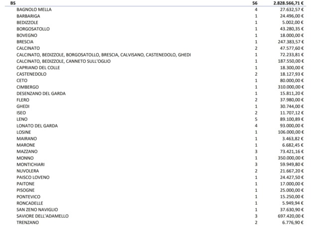 - Brescia: 56 interventi in 34 Enti coinvolti per un totale di oltre 2,8 milioni di euro;