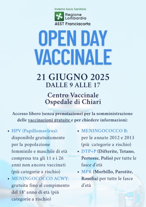 Il Centro Vaccinale dell’Ospedale di Chiari ospita sabato 21 giugno 2025 dalle 9 alle 17 l’Open Day Vaccinale di Asst Franciacorta. Si tratta di un’opportunità importante per prendersi cura della propria salute e di quella dei propri cari: l’accesso è libero e senza prenotazione, e sarà possibile ricevere informazioni utili e vaccinazioni gratuite.