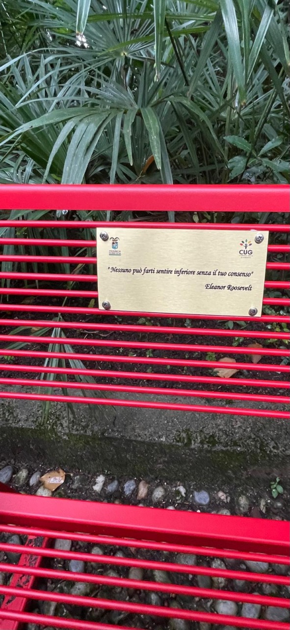 Sulla panchina, voluta come simbolo di memoria e di sensibilizzazione, è stata apposta una targa con la frase “Nessuno può farti sentire inferiore senza il tuo consenso”, pronunciata da Eleonor Roosvelt, attivista per i diritti civili e umani, diplomatica e autrice.