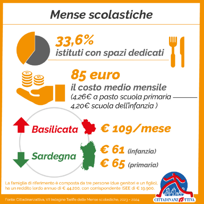 Gli italiani spendono una media di 4,20 euro al giorno per i pasti dei loro figli a scuola (scuola dell’infanzia) e 4,26 euro per la primaria. Come detto il 3% circa in più dell’anno scorso. Le variazioni però sono molto differenti a livello regionale: in Calabria si registra un aumento di oltre il 26%, mentre in Umbria la riduzione più evidente è di circa il 9%.