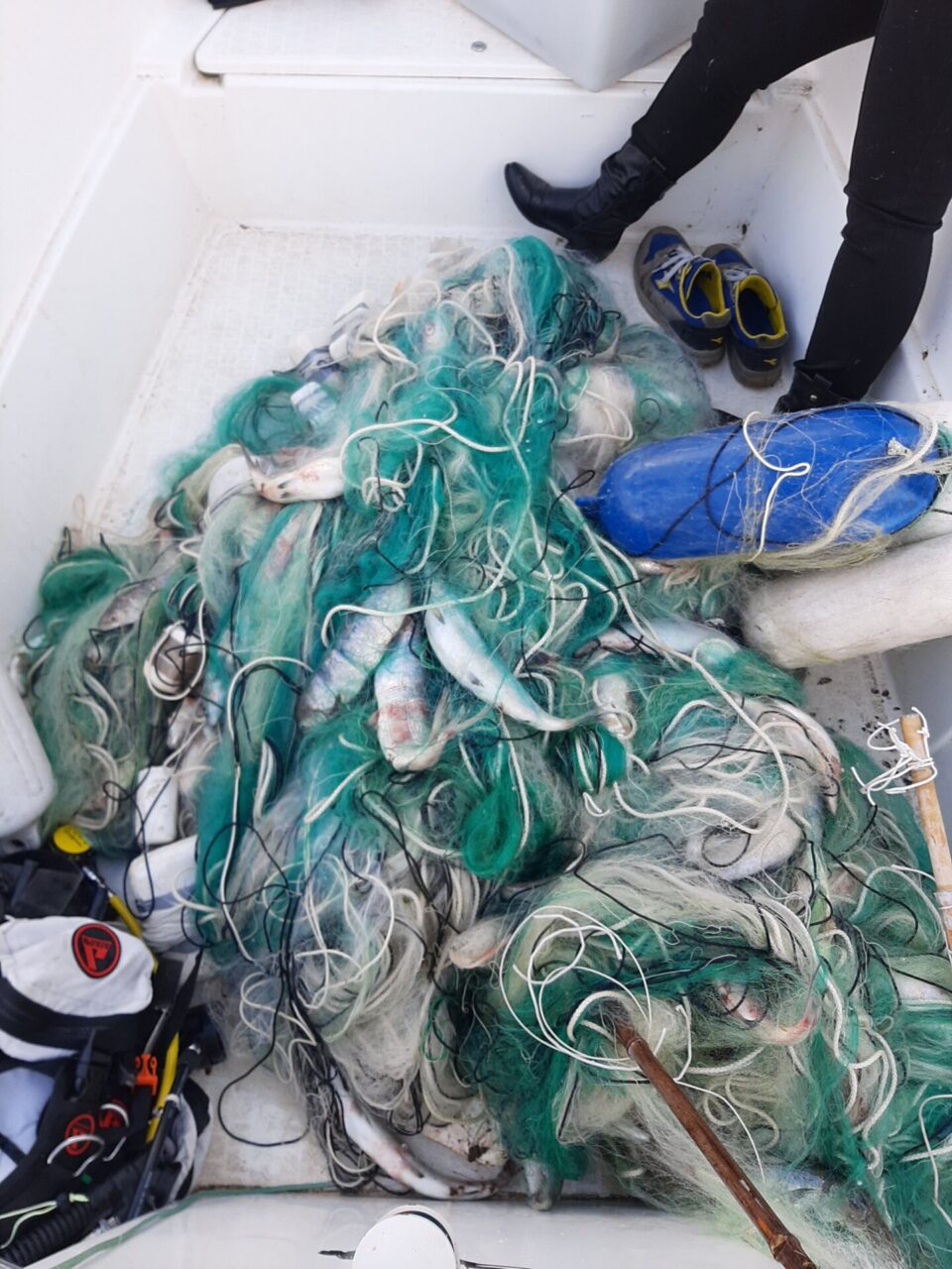 I sub del Wwf di Bergamo e Brescia si sono recati sul posto e hanno notato la grossa rete di nylon, aggrovigliata, persa o abbandonata (non legata alla pesca di frodo). Al suo interno, un enorme quantitativo di pesce (almeno 250 kg) morto e in stato di avanzata decomposizione.