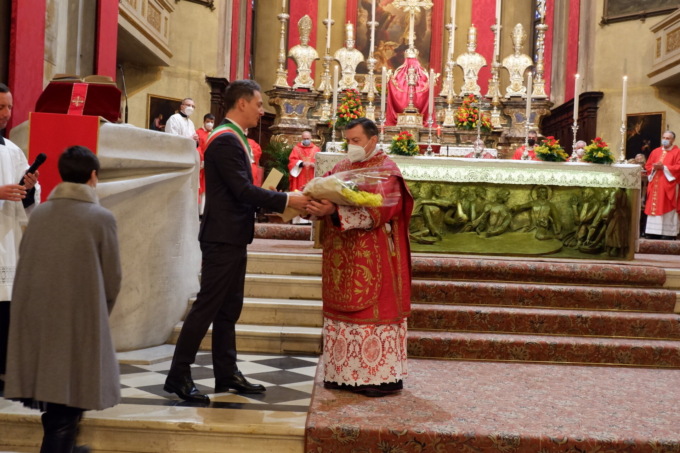 Durante la Messa nel Duomo dei Santi Faustino e Giovita, si è tenuto il tradizionale scambio dei doni tra Comune e Parrocchia, a suggellare la collaborazione proficua tra le due anime della Città. In qualità di primo cittadino, Vizzardi ha donato alla Parrocchia il tradizionale mazzo di tremarì (rosse rosse e mimose) accompagnato da una donazione per i lavori di restauro conservativo della Chiesa della Beata Vergine di Caravaggio, al cimitero. Contributo che prosegue l’impegno nella partecipazione al graduale recupero di questo luogo tanto caro alla comunità clarense.