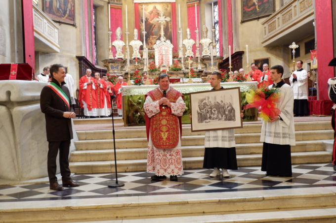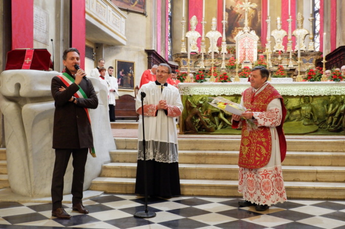 Al termine della cerimonia civile si è tenuta la Messa solenne in Duomo, presieduta dal prevosto, monsignor Gian Maria Fattorini, al termine della quale si è svolto lo scambio dei doni tra la Parrocchia e il Comune di Chiari. L’Amministrazione comunale anche per quest’anno ha rinnovato l’impegno economico al sostegno delle opere di recupero e di restauro della chiesa della Beata Vergine di Caravaggio al cimitero monumentale, testimoniando ancora una volta l’attaccamento della comunità clarense a questo luogo dall’alto valore simbolico per la Città. La Parrocchia, invece, ha consegnato un bellissimo quadro oltre che i tradizionali fiori.