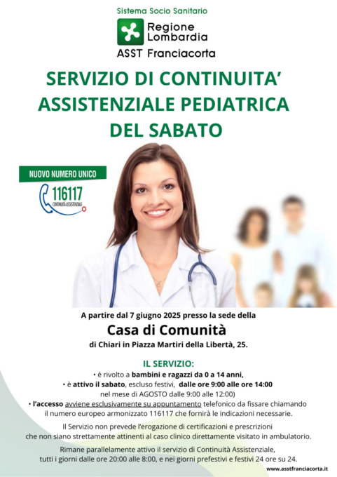Sarà avviato a partire dal prossimo 7 giugno il Servizio di Continuità Assistenziale Pediatrica nella sede della Casa di Comunità di Chiari, in piazza Martiri della Libertà 25. Tale servizio è rivolto a bambini e ragazzi da 0 a 14 anni e consente di dare continuità alle prestazioni erogate dal Pediatra di Famiglia durante la settimana.