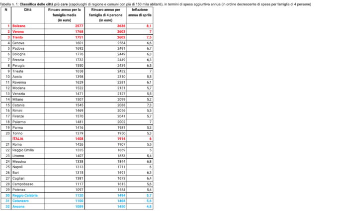 In testa alla classifica dei capoluoghi e delle città con più di 150 mila abitanti più care (Tabella n. 1), Bolzano dove l’inflazione annua, pari a +8,1%, la più alta d’Italia, si traduce nella maggior spesa aggiuntiva annua equivalente, in media, a 2577 euro, ma che balza alla cifra astronomica di 3636 euro per una famiglia di 4 componenti. Al secondo posto Verona, dove il rialzo dei prezzi del 7% determina un incremento di spesa pari a 1768 euro per una famiglia media, 2603 euro per una di 4 persone. Sul gradino più basso del podio Trento, dove il +7,5%, la seconda maggiore inflazione, genera una spesa supplementare pari, rispettivamente, a 1751 e 2602 euro annui. Al quarto posto Genova (+6,6%, 1601 e 2564 euro), poi Padova (+6,7%, 1692 e 2491 euro) e Bologna (+6,3%, +1776 e +2449 euro). La città più virtuosa è Ancona, con un’inflazione del 4,8% e una spesa aggiuntiva per una famiglia tipo pari a “solo” 1089 euro, 1450 per una famiglia di 4 componenti. Segue Catanzaro (+5,6%, 1100 e 1468 euro) e Reggio Calabria (+5,7%, 1120 e 1494 euro).