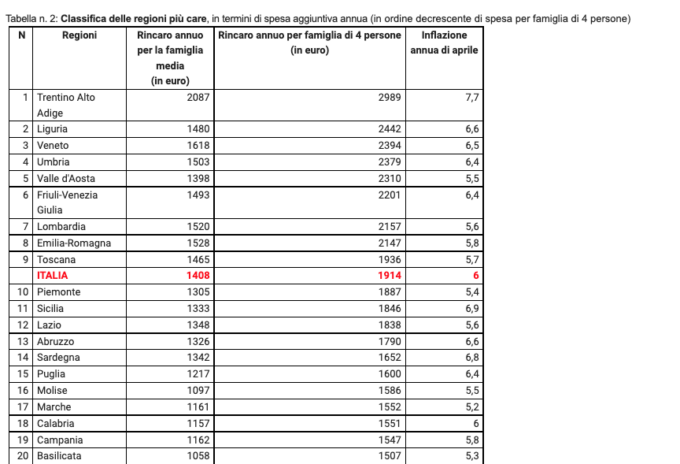 In testa alla classifica delle regioni più costose (Tabella n. 2), con un’inflazione annua a +7,7%, il Trentino che registra a famiglia un aggravio medio pari a 2087 euro su base annua, 2989 euro per una famiglia di 4 persone. Segue la Liguria, dove la crescita dei prezzi del 6,6% implica un’impennata del costo della vita pari, rispettivamente, a 1480 e 2442 euro, terzo il Veneto, +6,5%, con un rincaro annuo di 1618 (al 2° posto come dato medio) e 2394 euro per 4 componenti. La regione più risparmiosa è la Basilicata, +5,3%, pari a 1058 e 1507 euro. La Lombardia si colloca invece al settimo posto.