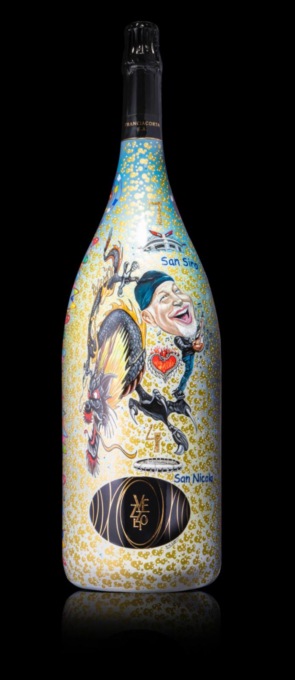 “Buon Annoooo!!!! Auguriii!!! Apro questa bottiglia (6 litri Franciacorta Vezzoli) dipinta dal maestro Giampaolo Belotti e faccio un brindisi con tutti voi !!! Evvivaaa! (occhio alla bottiglia, è davvero spettacolare, richiama i sette concerti di San Siro, i quattro di Bari e poi c’è… il drago)”