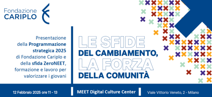 “Le sfide del cambiamento, la forza della comunità” è il titolo dell’evento con cui Fondazione Cariplo presenta la Programmazione strategica 2025 e la sfida ZeroNeet, avviata in stretta sinergia con Intesa Sanpaolo per valorizzare i giovani, che si svolge il 12 febbraio alle ore 11 al Meet – Digital Culture Center di Milano. I posti per partecipare in presenza sono esauriti, ma è possibile seguire la diretta streaming a questo link e nei giorni successivi il video verrà reso disponibile on demand.