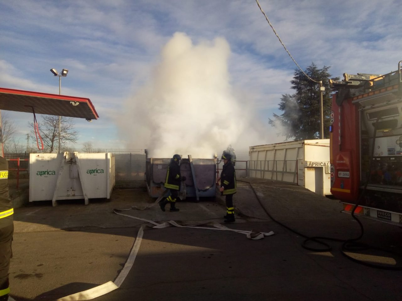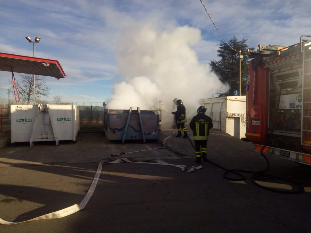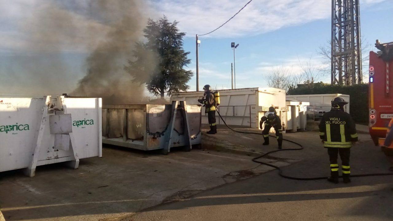 A fuoco il cassonetto dell’ingombrante all’isola ecologica di Rudiano. Sul posto i Vigili del fuoco volontari di Chiari.