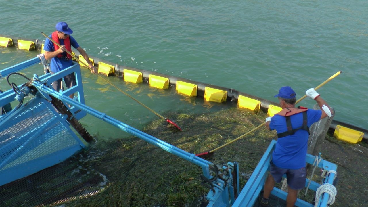 Le alghe vengono recuperate dal battello e smaltite