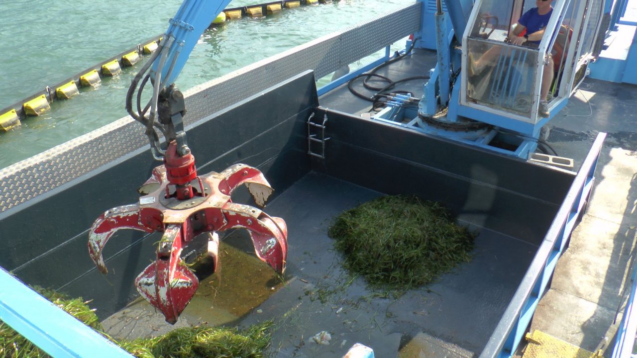 Il battello spazzino di Mpl provvede, in un secondo momento, al recupero ed allo smaltimento delle alghe e le