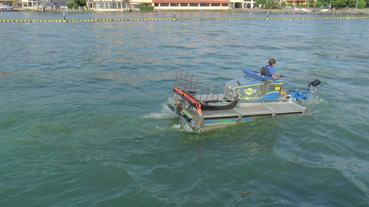 “Abbiamo provveduto a perimetrare la zona di lavoro nella giornata di lunedì, e da stamattina siamo operativi – ha spiegato Roberto Bendotti, tecnico dell’ente – Il mezzo che stiamo utilizzando è il Truxot Dm5045. La sua lama viene immersa nell’acqua fino a due metri di profondità: intercetta le praterie di Vallisneria Spiralis e le falcia alla base dell’alga. Stiamo lavorando sulla zona più critica del lago, in un areale di sfalcio di circa 70mila metri quadrati”.