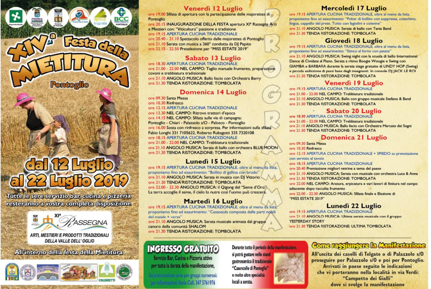 Al via stasera la Festa della Mietitura a Pontoglio. La kermesse continuerà fino al 22 luglio. La sfilata inizierà alle 19 e alle 20.15 ci sarà l’inaugurazione.