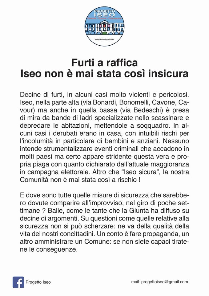 Dopo aver dato lettura del volantino di Progetto Iseo, il sindaco ha chiesto al capogruppo Pieranna Faita quale sia stata la fonte utilizzata per definire iseo “così insicura”.