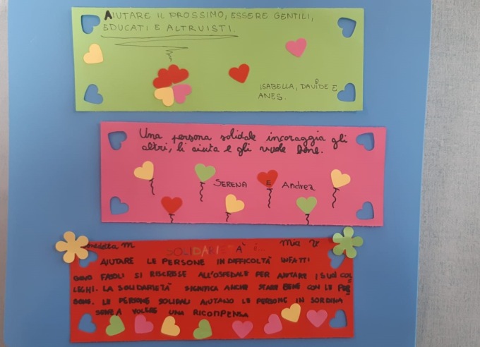 I ragazzi della scuola media sono invece partiti dall’etimologia della parola solidarietà, per costruire un solido composto da tanti cubi, evidenziando che, togliendo un pezzo, il cubo cadeva. Un’esperienza che ha rimarcato come, se non c’è unione, non c’è solidarietà. Nel video, «Diversi ma solid-ali», si dice che: «La solidarietà è l’unico incastro vincente». Anche gli alunni della secondaria di primo grado hanno poi sperimentato la donazione al banco alimentare.