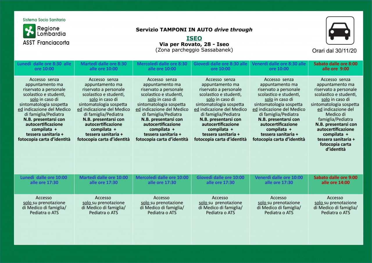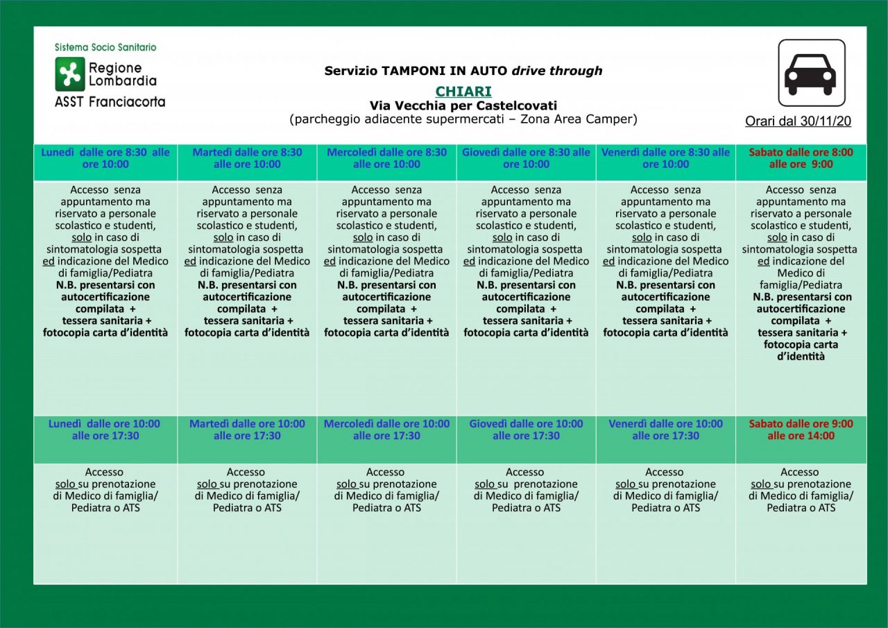 L’ambulatorio territoriale gestisce anche i tamponi in auto («drive through»). I nuovi orari sono in vigore da lunedì (30 novembre). La postazione di Chiari, inoltre, sarà attiva anche nei giorni festivi: 8 dicembre, 26 dicembre e 6 gennaio 2021. Ci sono però delle regole. Dalle 8 alle 9, l’accesso è solo per personale scolastico e studenti. Dalle 9 alle 14, invece, solo su prenotazione.
