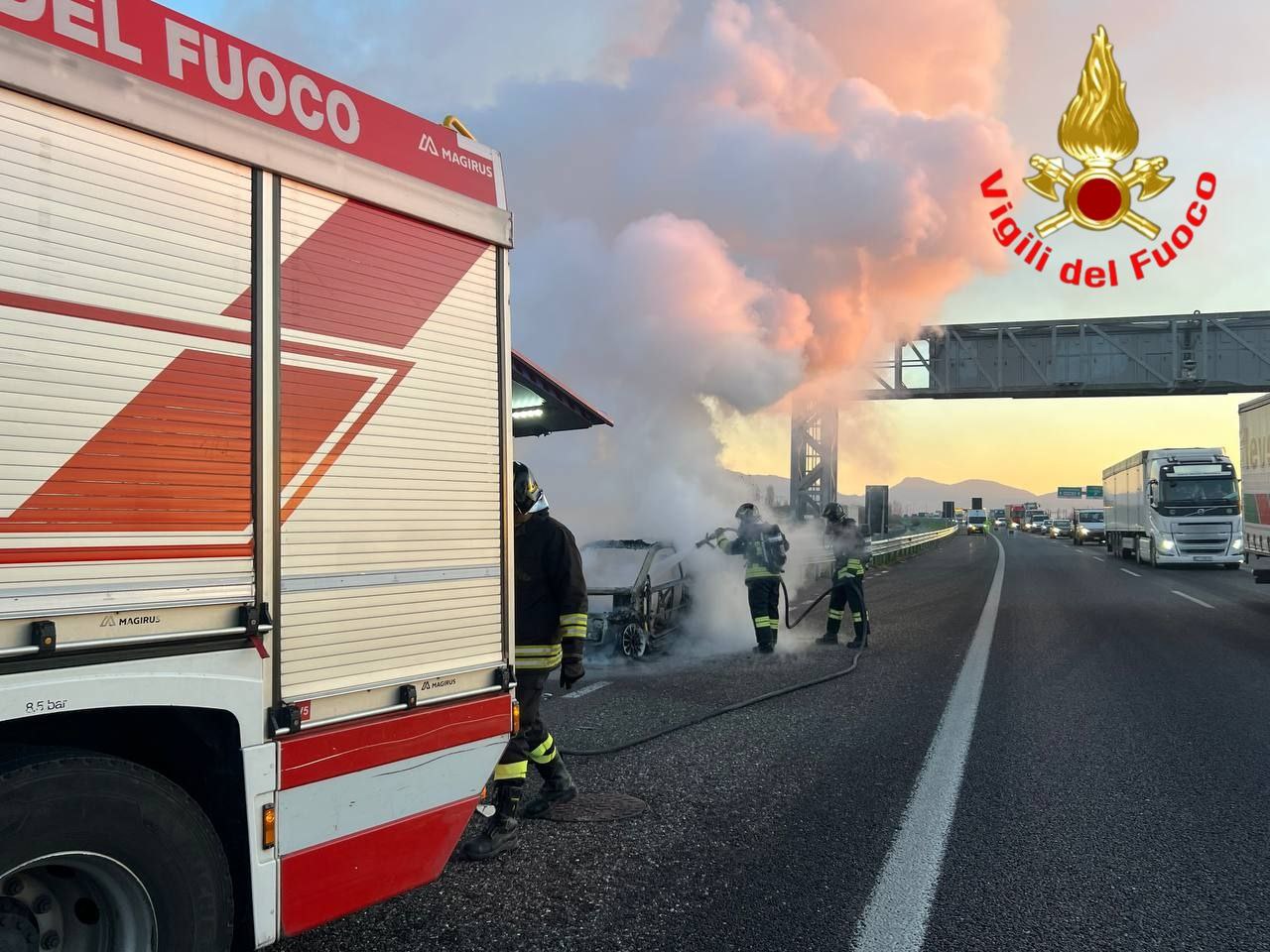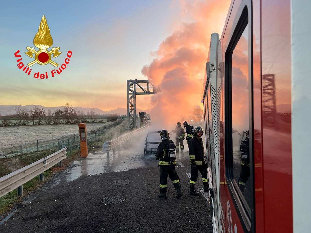 Auto a fuoco sulla A35 a Rovato direzione Milano.