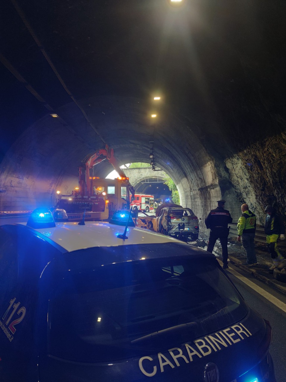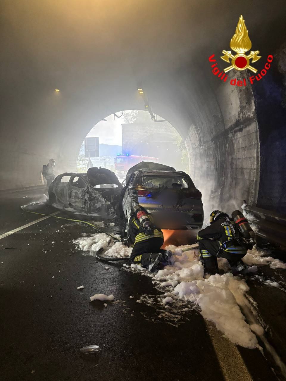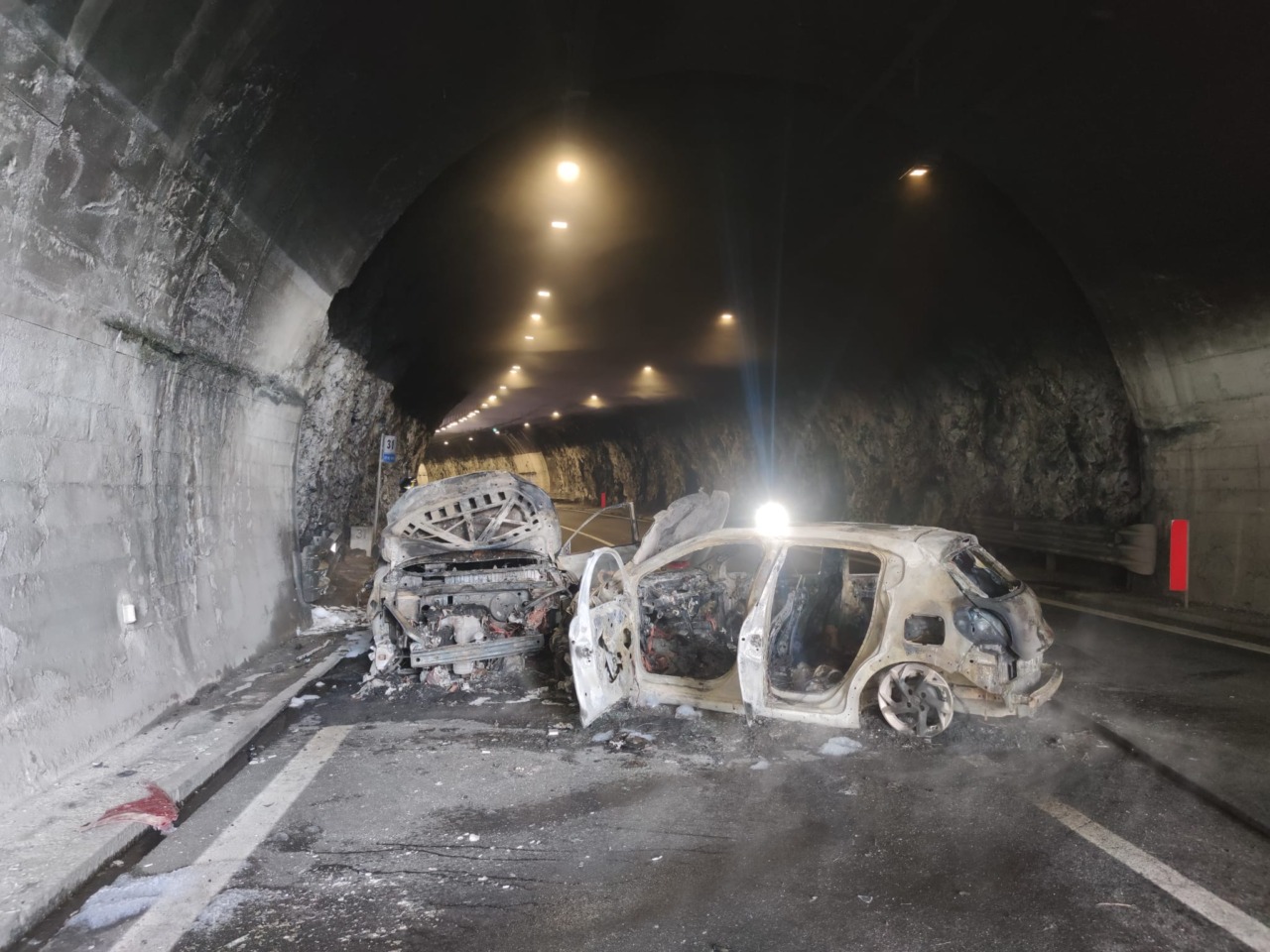 Auto in fiamme dopo lo scontro nella Galleria a Marone.