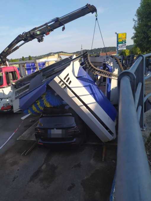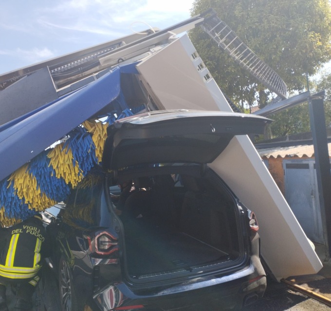 Auto urta contro i rulli dell’autolavaggio: crolla la struttura.